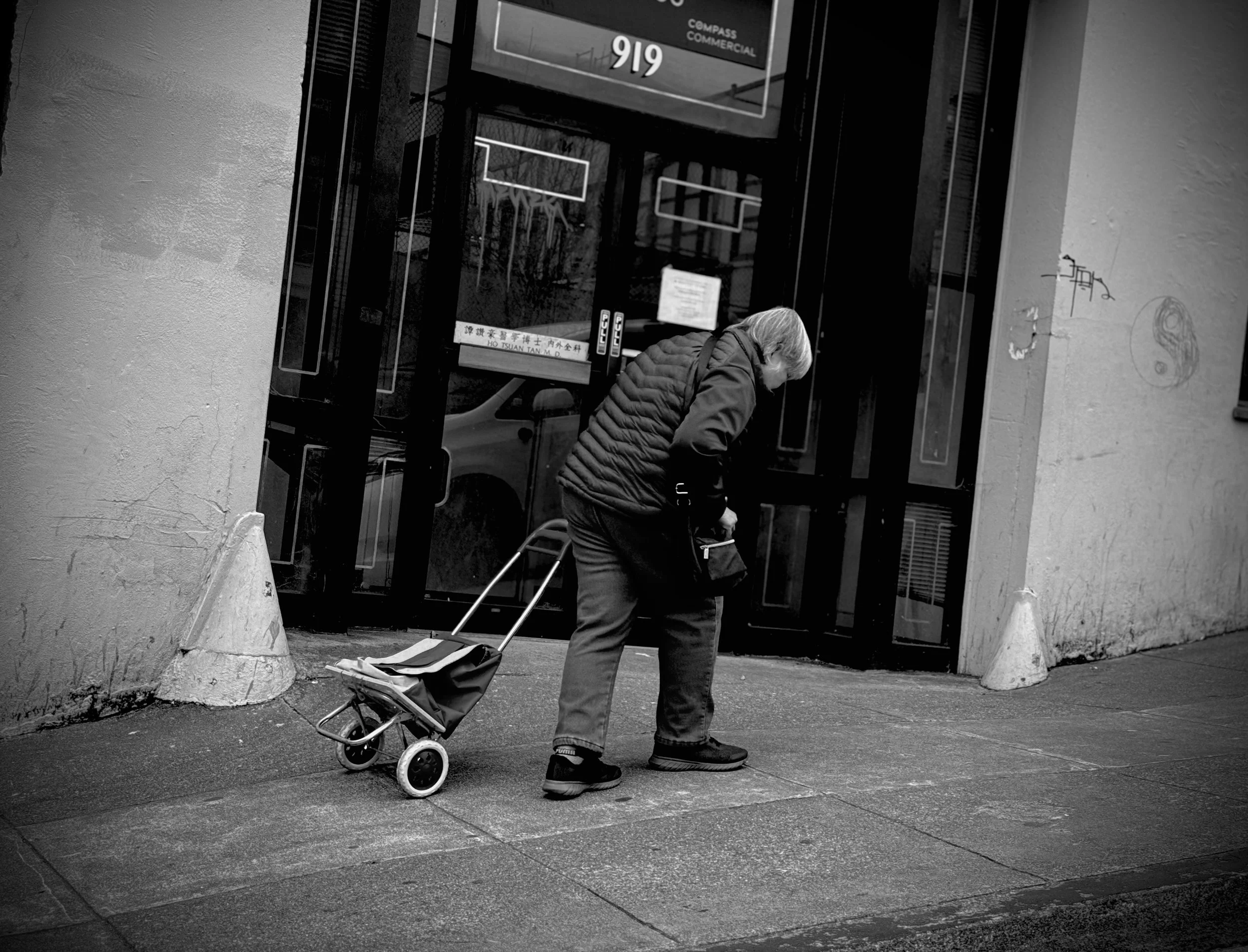 I saw an elderly woman lumbering up a street in San Francisco. She was bent over, moving slow yet determined.